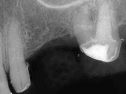 A 75-year-old female was referred for endodontic treatment associated with a cariously exposed posterior abutment tooth, #15 (Fig. 3). After taking a thorough medical history including blood pressure measurement, a clinical examination of the upper-left quadrant was performed. The need for endodontic treatment prior to the fabrication of a permanent fixed bridge was readily apparent.
