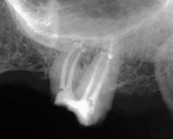 Analytic Autofit Greater Taper Gutta Percha™ (SybronEndo) in tapers .04 and .06 were used for obturation of the root canals. The gutta-percha cones were fit for point tug-back in each canal in the presence of NaOCl and a cone-fit radiograph was taken to verify correct length and fit. Final irrigation of the canals consisted of EDTA liquid, NaOCl, and then 95% ethanol. Analytic Autofit Greater Taper Paper Points™ (SybronEndo) were used to dry the root canals. A thick mix of Kerr Pulp Canal Sealer EWT™ (SDS Kerr) was prepared. A small amount of sealer was then placed on the tip of each master gutta-percha cone prior to being placed into the canal. A warm vertical method of obturation was used. The System B Heat Source™ (SybronEndo) was used for the down-pack according to manufacturer’s instructions. When the heat source was removed, the gutta-percha was then condensed using a Dovgan Plugger™ (Miltex Dental). The canals were then back-filled with gutta-percha using the Obtura II System™ (Obtura Spartan). The larger end of a Dovgan Plugger was then used to vertically condense the gutta-percha at each canal orifice. The coronal access was sealed with a temporary restorative material and post-operative radiographs were then taken (Fig. 5).