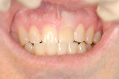 The discoloration of #9 is very obvious, however, it has never really bothered the patient.