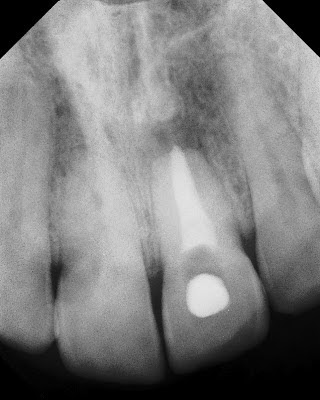 Our diagnosis was: Prior RCT w/ Asymptomatic Apical Periodontitis. The tooth was currently symptom free, but had slight mobility and an obvious apical lucency.