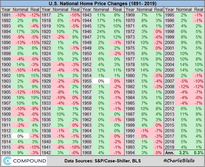 According to Compoundadvisors.com, since 1891, U.S. home prices have increased 3.2% per year before inflation (nominal) and 0.3% after inflation (real).