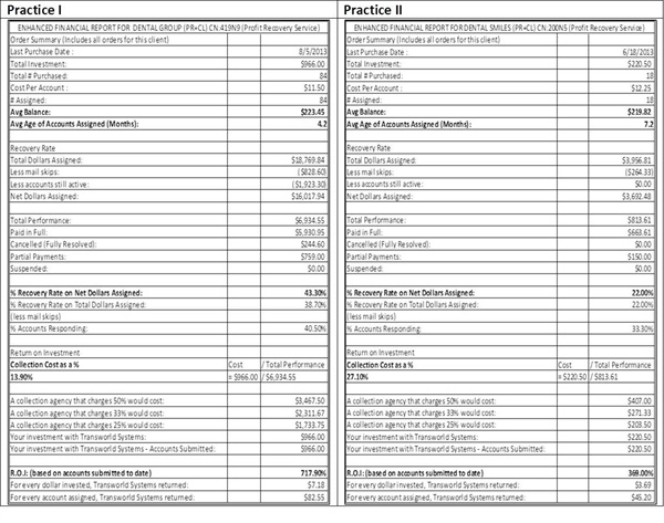 Each office began service roughly at the same time with average balances within $3.60 of one another. Both specialize in general dentistry within the same demographic region. They are using the same software solution which interfaced with their Dentrix and EagleSoft practice management systems. The solution provided both practices with a tool they controlled to quickly identify past due accounts (based on criteria they set). The practices were then able to review and securely transfer only selected accounts with a single mouse click (No manual data entry required). The collection cost per account was from $11.50 to $12.25 (Flat fee—No percentages)