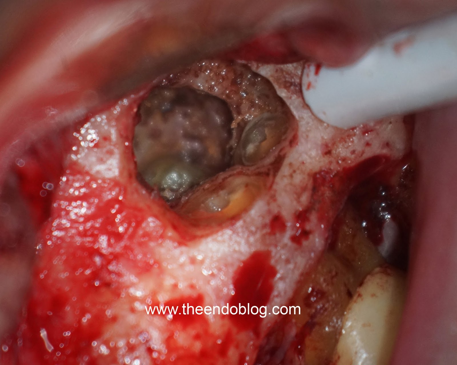 Endodontic surgery on maxillary molars is usually limited to the MB and DB roots - through a buccal approach. Surgical treatment of the palatal root often requires a palatal surgical approach, and is therefore rarely done.  In this particular surgical case, due to the root anatomy and size of the periapical lesion and osteotomy, all three roots were accessed through a buccal surgical approach.
