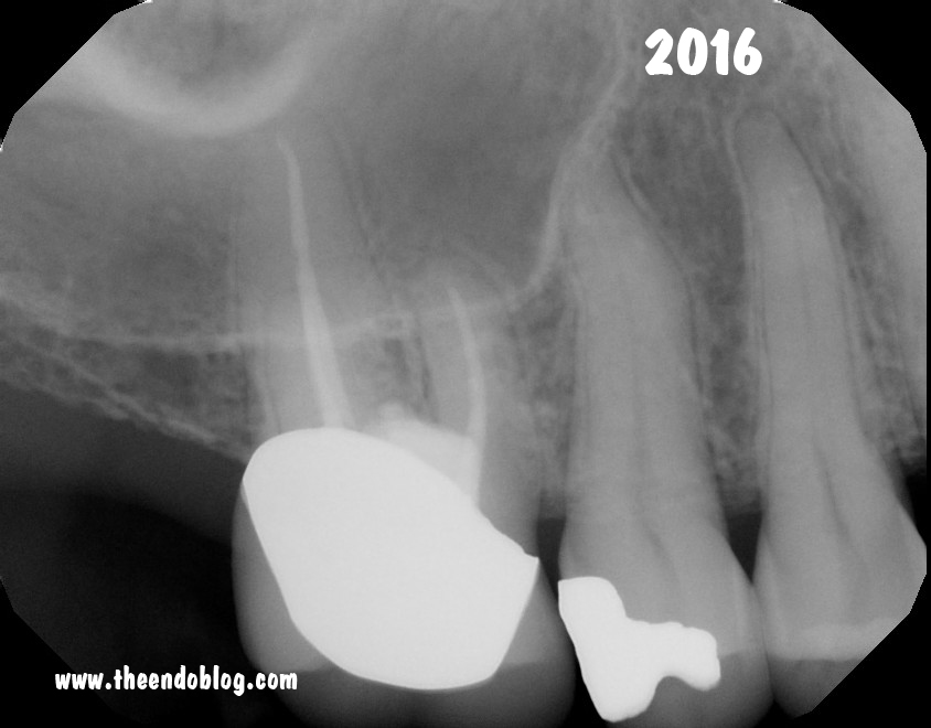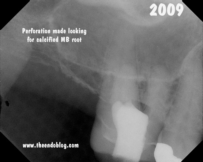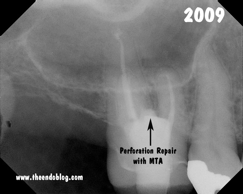 The treatment for this tooth was RCT completion and repair of the iatrogenic damage using Mineral Trioxide Aggregate (MTA).