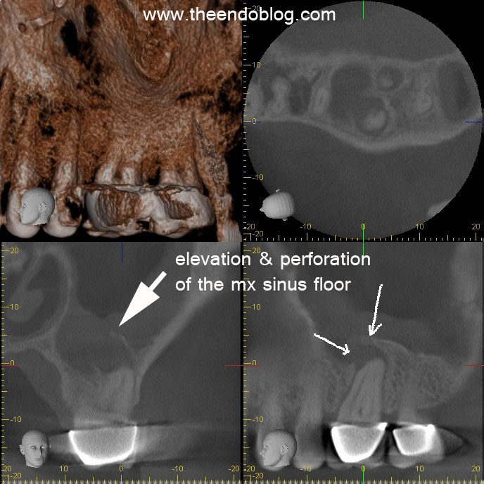 CBCT (J. Morita Veraviewepocs 3De) demonstrates a large periapical radiolucency around the mesio-buccal root. The sagittal and coronal views both show elevation in the floor of the sinus (halo effect) as well as perforation of the floor of the sinus. Endodontic treatment is required BEFORE sinus treatment. Failure to address the odontogenic source of the sinus infection will result in recurrent sinus infections.
