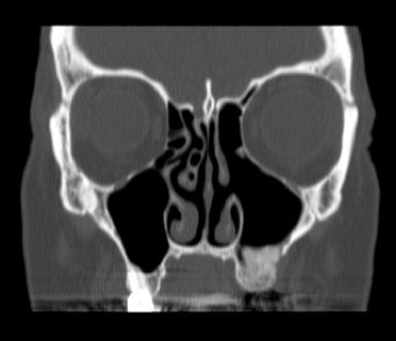 A 51 year old female presents with one year of left facial & tooth pain, left nasal obstruction, postnasal drainage and headaches. Past dental history is significant for RCT of teeth 10 & 11, apicoectomy of tooth #10, and dental implants #12 & 13. The implants failed and she developed an oral antral fistula after removal of the implants and debridement of necrotic bone. Coronal CT image demonstrating severe left maxillary and ethmoid sinus disease. This one sided sinus disease was of odontogenic origin. |
