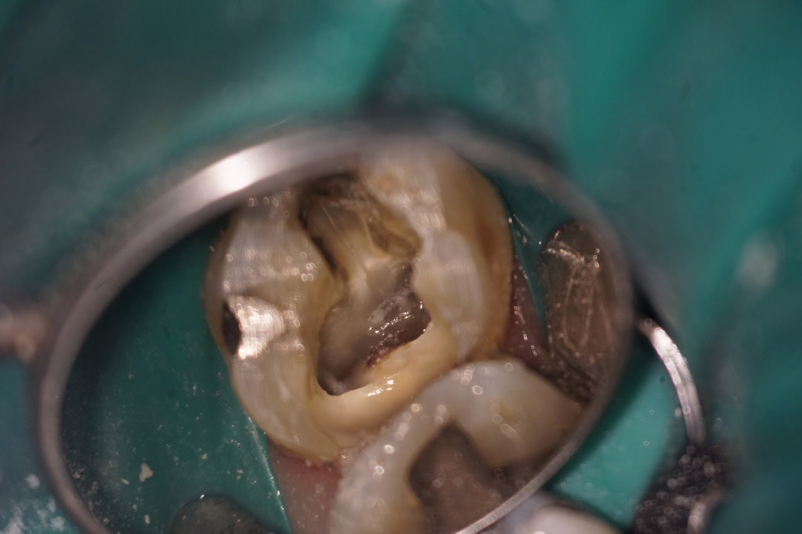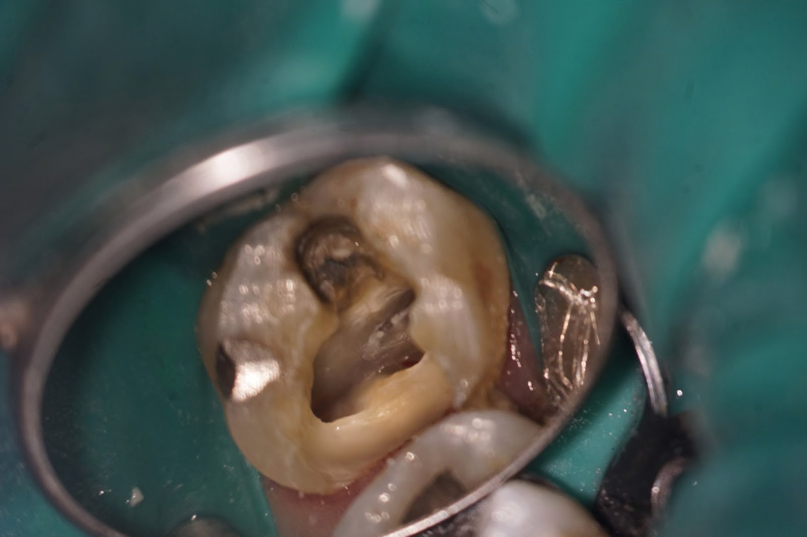 Distal decay is removed, mesial amalgam removed.  Crack identified on the mesial wall of the pulp chamber.