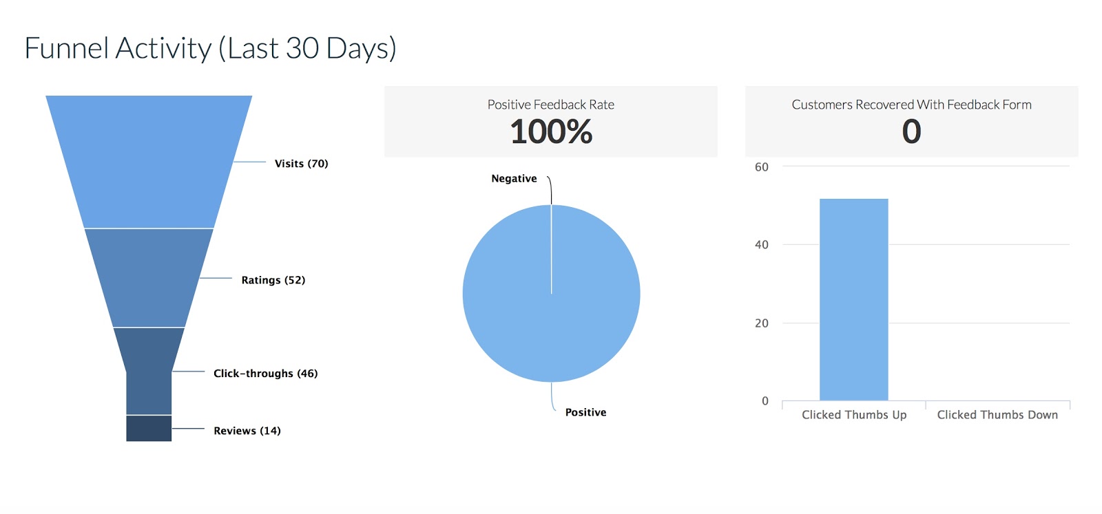 In the last 30 days, we were able to get 70 people to visit our customized landing page,  46 to click through and  14 to complete the process of leaving our practice a review on a third party review site like Google, Yelp, HealthGrades, RateMDs etc.