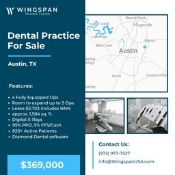 General Dental Practice – Austin, TX – FOR SALE – $369,000 - This dental office opportunity is tucked into one of the most dynamic...