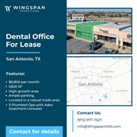 San Antonio, TX 🦷 Dental Office for Lease – $6,800/Month 💰 $6,800/mo | 🏢 1,800 SF | 🦷 5 Plumbed Ops – This 1,800 sq ft dental office...