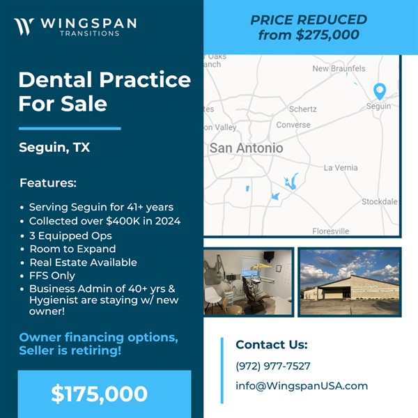 General Dental Practice Seguin, Texas FOR SALE $175,000 – PRICE REDUCED from $325K, MOTIVATED SELLER!  -- General practice serving the community for 41 years; at current location 25 years with 964 sq. ft and 3 ops fully equipped; Real estate is available for sale in addition to the practice for $175,000. Plus, negotiate the acquisition of the vacant space next door and there’s the potential to expand an additional 1,067 sq. ft., for a total of approx. 2,000 sq. ft. Fantastic practice with deep community roots; a dedicated business administrator who has been with the practice for over 40 years, as well as a hygienist with over 40 years of experience would like to remain on board with new owner, offering invaluable continuity and support to ensure a seamless transition. Motivated seller; owner financing options available. Located in a medical, professional condo building in a suburban area. This facility includes x-ray units in each op, practice management software and is presently open about 3 days/week. Patient base is all FFS; no PPO, no Medicaid, no DMO. Our sellers require a signed NDA before we can share practice details. To get started, simply complete a Buyer Form and NDA at wingspantransitions.com/buyer-form. This only needs to be done once every six months. If you’ve already completed this within that timeframe, just email info@WingspanUSA.com or text us with your name and the listing you're interested in — we’ll verify your profile and NDA are active and send the details your way. Our goal is to respond within one business day.