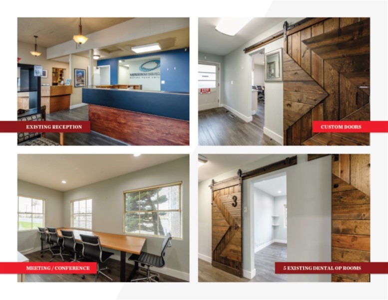 The 2,100 square foot vacated dental office space is move-in ready for the next doctor. It features 5 plumbed operatory rooms, a panoramic x-ray room, a lab, kitchen and break area, a conference room, an administrative office, a data room, and a reception and waiting area. The space was recently remodeled with luxury vinyl tile flooring and stylish barn doors.