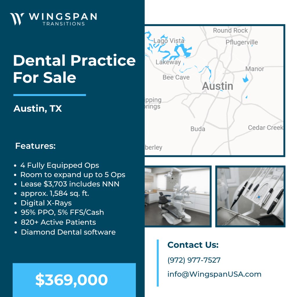 General Dental Practice – Austin, TX – FOR SALE – $369,000 - This dental office opportunity is tucked into one of the most dynamic and rapidly growing areas just outside the urban core—offering visibility, convenience, and long-term value. Established for 37 years, this general practice features 4 fully equipped ops, with room to expand to 5 ops total. The 1,584 sq. ft. office is located in a strip-center. Lease is $3,703/month, including NNN. This facility includes Digital X-rays, Diamond Dental software, and an intraoral camera that performs exceptionally well. The entire computer system was recently enhanced at a cost of $35,000—an upgrade all practices will be required to complete by the end of 2025. The office has not relied on advertising to attract patients, resulting in a loyal, long-standing patient base built through word-of-mouth and community trust. It is the only dental office recommended by both the local homeowners association and community welcome programs. The patient base is 95% PPO, FFS/Cash Pay 5% (no DMO, no Medicaid), with over 820+ active patients in the past 24 months. The long-standing business manager is dedicated to ensuring a smooth transition for a new doctor! Our sellers require a signed NDA before we can share practice details. To get started, simply complete a Buyer Form and NDA at wingspantransitions.com/buyer-form. This only needs to be done once every six months. If you’ve already completed this within that timeframe, just email info@WingspanUSA.com or text us with your name and the listing you're interested in — we’ll verify your profile and NDA are active and send the details your way. Our goal is to respond within one business day. Listing 1025-AN