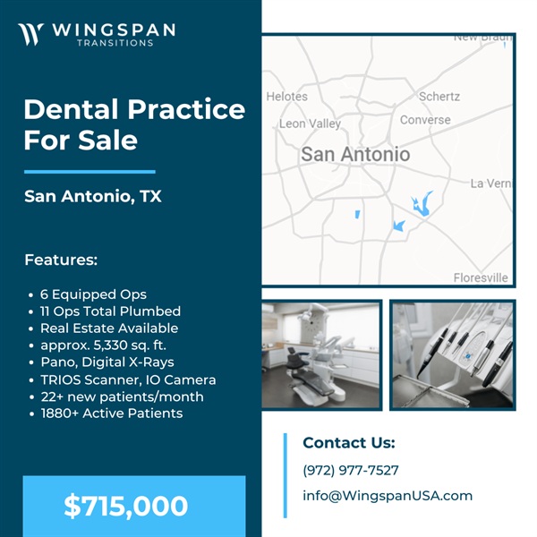 General Dental Practice San Antonio, Texas FOR SALE $715,000 – Real Estate is available in addition to the practice for $1,350,000, stand alone building, office is approx. 5,330 sq ft, with 6 ops equipped and 11 total ops plumbed. Practice has been established for over 25 years. The office is presently open about 4 days/week. Technology includes: CBCT, Pano, digital x-rays, TRIOS Scanner and IO Camera; all equipment is in great condition. Patient base about 76% PPO, 16% FFS/Self-Pay, 8% Medicaid and no DMO with 1880+ active patients and about 22+ new patients/month. Interested in learning more? Our sellers require a signed NDA before we can share practice details. To get started, simply complete a Buyer Form and NDA at wingspantransitions.com/buyer-form. This only needs to be done once every six months. If you’ve already completed this within that timeframe, just email info@WingspanUSA.com or text us with your name and the listing you’re interested in — we’ll verify your profile and NDA are active and send the details your way. Our goal is to respond within one business day. Listing 1028-SC