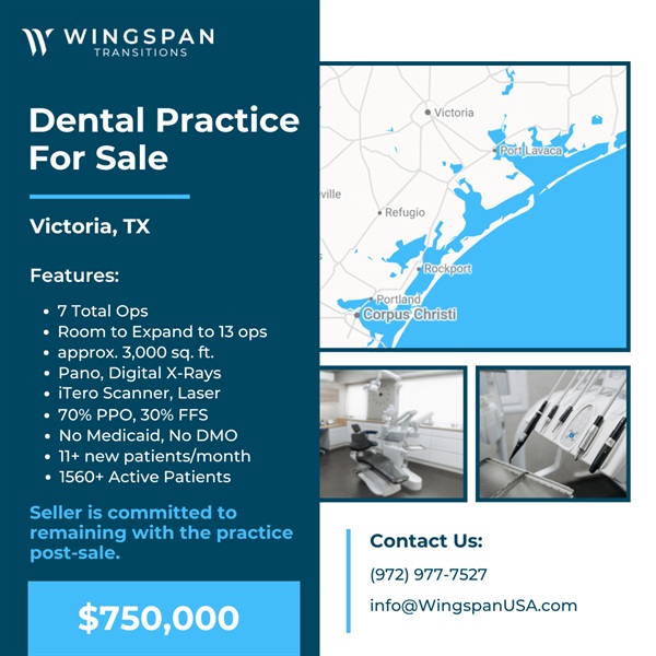 General Dental Practice – Victoria, Texas – FOR SALE – $750,000 – Real estate available in addition to the practice for $1,015,000. Established 17 years, 3,000 sq. ft. facility features 7 total plumbed operatories (room to expand about 6 more ops). Seller is committed to remaining with the practice post-sale. Technology includes Pano, digital X-rays, iTero scanner, laser and Eaglesoft. The payer mix is 70% PPO, 30% FFS/Self Pay; no Medicaid, no DMO. New patients average 11+/month, with over 1560+active patients. Interested in learning more? Our sellers require a signed NDA before we can share practice details. To get started, simply complete a Buyer Form and NDA at wingspantransitions.com/buyer-form. This only needs to be done once every six months. If you’ve already completed this within that timeframe, just email info@WingspanUSA.com or text us with your name and the listing you’re interested in — we’ll verify your profile and NDA are active and send the details your way. Our goal is to respond within one business day. Listing 1035-AN