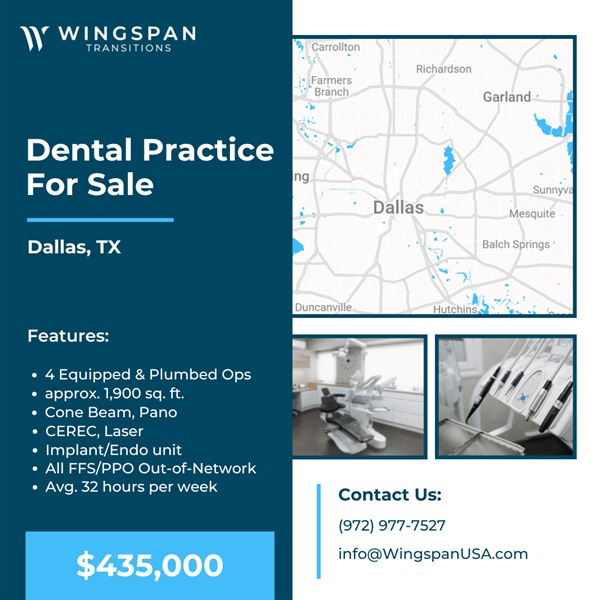 General Dental Practice Dallas, Texas FOR SALE $435,000 – General dentistry office with approx. 1,900 sq ft, 4 ops equipped. The office is presently open about 32 hours/week and using Eaglesoft. Technology includes: Galileos Cone Beam, Pano, CEREC, Fotona Laser NdYag, ErYag, digital x-rays, and Intraoral Cameras; all equipment is in great condition. Patient base all out of network, no insurance contracts, no Medicaid, no DMO with 920+ active patients. Interested in learning more? Our sellers require a signed NDA before we can share practice details. To get started, simply complete a Buyer Form and NDA at wingspantransitions.com/buyer-form. This only needs to be done once every six months. If you’ve already completed this within that timeframe, just email info@WingspanUSA.com or text us with your name and the listing you're interested in — we’ll verify your profile and NDA are active and send the details your way. Our goal is to respond within one business day. (Listing 1042-SC)