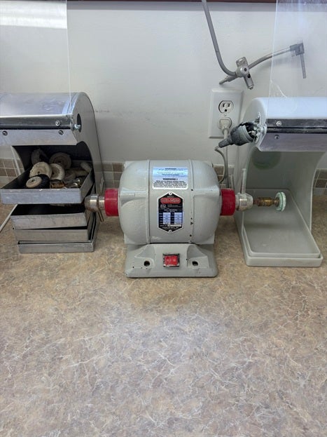 • Dual-spindle bench lathe used for trimming, polishing, and finishing dental appliances