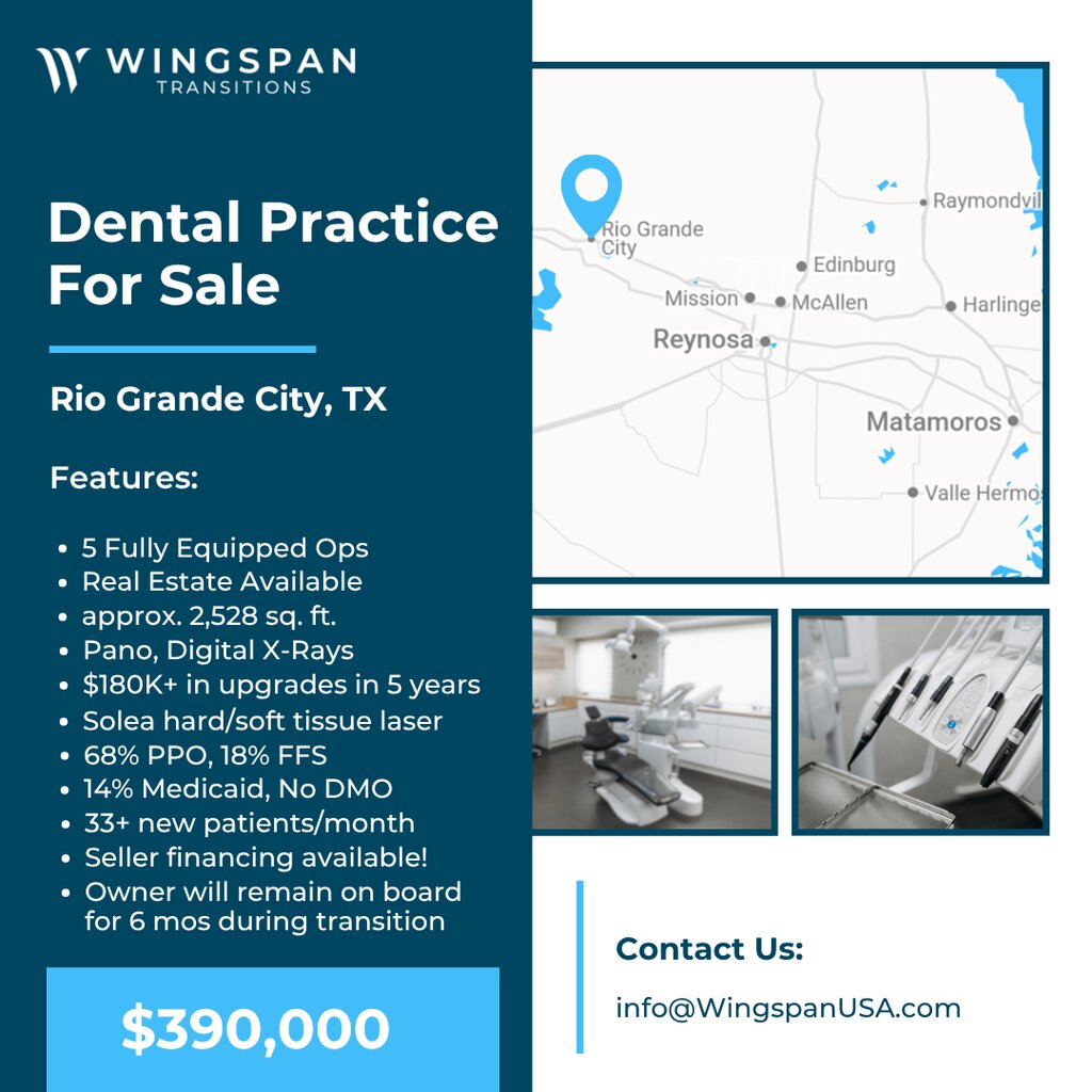 General Dental Practice Rio Grande City, Texas FOR SALE $390,000 – SELLER FINANCING OPTIONS! Dentist is willing to stay on board for six months for a smooth transition. Real Estate is available in addition to the practice for $510,000, stand alone building, office is approx. 2,528 sq ft, 5 ops equipped. Practice has been established for over 37 years. The office is presently open about 26 hours/week and using Eaglesoft. Technology includes: Pano, digital x-rays, intraoral camera, Solea hard/soft tissue laser, LED lights in the rooms...recent upgrades, modernized office; all equipment is in great condition. Seller has spent $180K in last five years investing in upgrades. Patient base about 68% PPO, 18% FFS/Self-Pay, 14% Medicaid and no DMO with 1760+ active patients and about 33+ new patients/month. Our sellers require a signed NDA before we can share practice details. To get started, simply complete a Buyer Form and NDA at wingspantransitions.com/buyer-form. This only needs to be done once every six months. If you’ve already completed this within that timeframe, just email info@WingspanUSA.com or text us at (972) 977-7527 with your name and the listing you’re interested in — we’ll verify your profile and NDA are active and send the details your way. Our goal is to respond within one business day. (Listing 1029-AN)