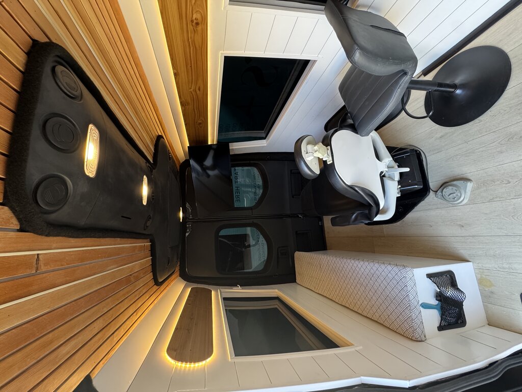 -Custom professional build-out on the interior with ship lap walls, laminate floor, highly secure custom dental chair bolted through the floor for safety, LED lighting (two options one on ceiling and another on custom panels), TV mounted to the wall, extra storage bench as well as for guest seating, extra custom storage added under ceiling in front as well.