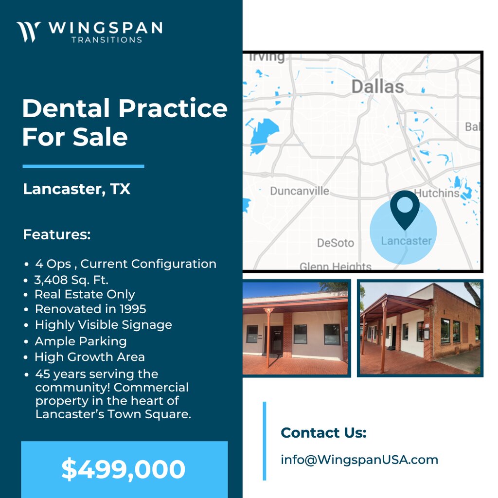 Commercial Dental Property for Sale – Lancaster, Texas – FOR SALE – $499,000. Rare opportunity to acquire a 3,408 SF historic commercial building located in the heart of Lancaster’s Town Square. Built in 1920 and renovated in 1995, this well-maintained property offers high visibility, strong signage, ample parking, and long-term upside in a growing downtown corridor. The space has supported a successful business for 45 years and is currently configured with 4 operatories, making it well-suited for dental office use. Positioned in a high-growth area with supportive sales comparables, this is an ideal opportunity for an owner-user or investor seeking character, location, and stability. To get started, simply complete a Buyer Form and NDA at wingspantransitions.com/buyer-form. This only needs to be done once every six months. If you’ve already completed this within that timeframe, just email info@WingspanUSA.com or text us with your name and the listing you’re interested in — we’ll verify your profile and NDA are active and send the details your way. Our goal is to respond within one business day.