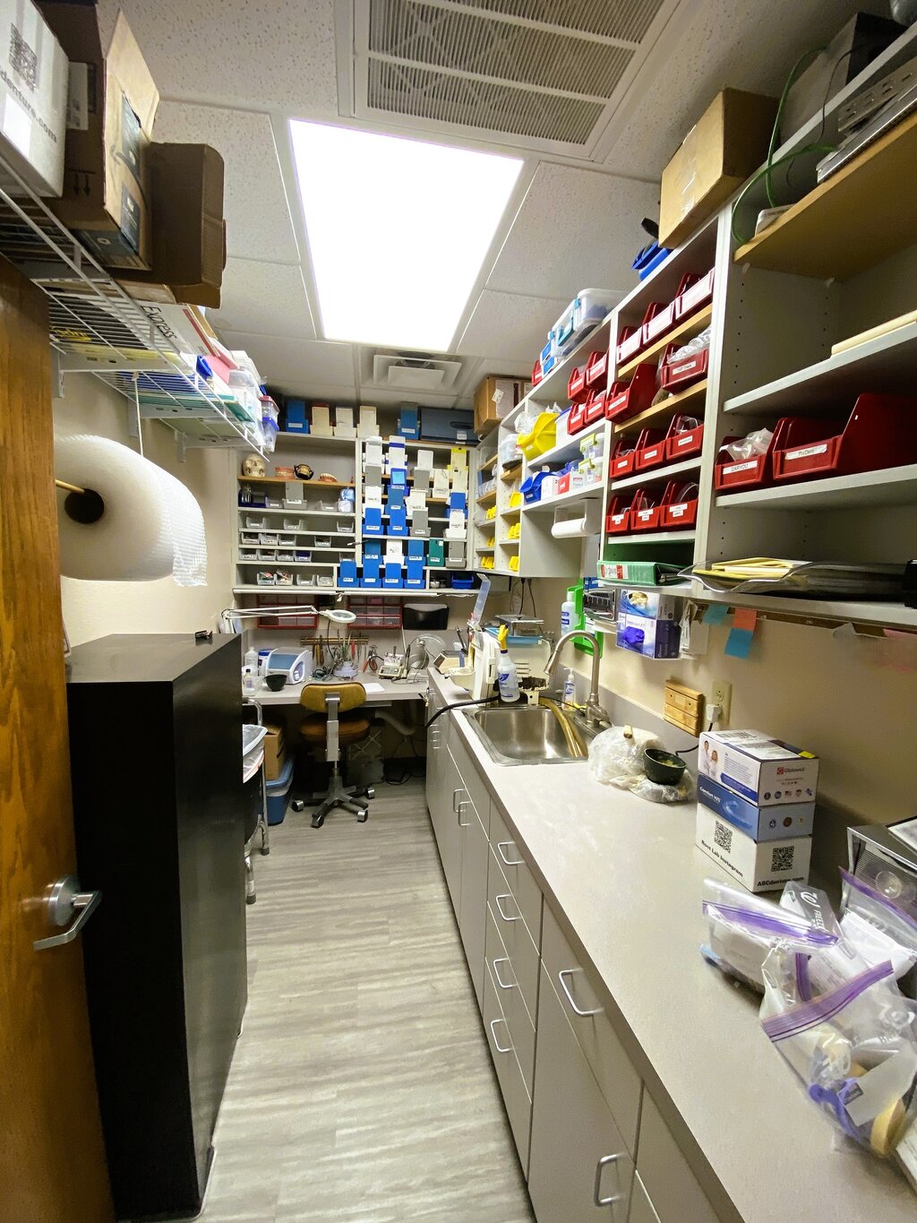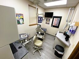 The 2,400-square-foot, free-standing dental office features six fully equipped operatories, each with a wall-mounted x-ray unit. Additional equipment includes a mobile x-ray unit, a Vatech 2D panoramic unit, five intraoral cameras, and a mobile nitrous cart with flow meter.