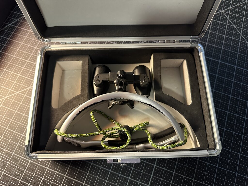 SurgiTel EVK 450 4.5x Compact Prism flip-up loupes (FLM / Front-Lens-Mounted style on Oakley frames) – excellent condition, lightly used, always stored in the original protective case when not in use. Priced firm for quick sale.