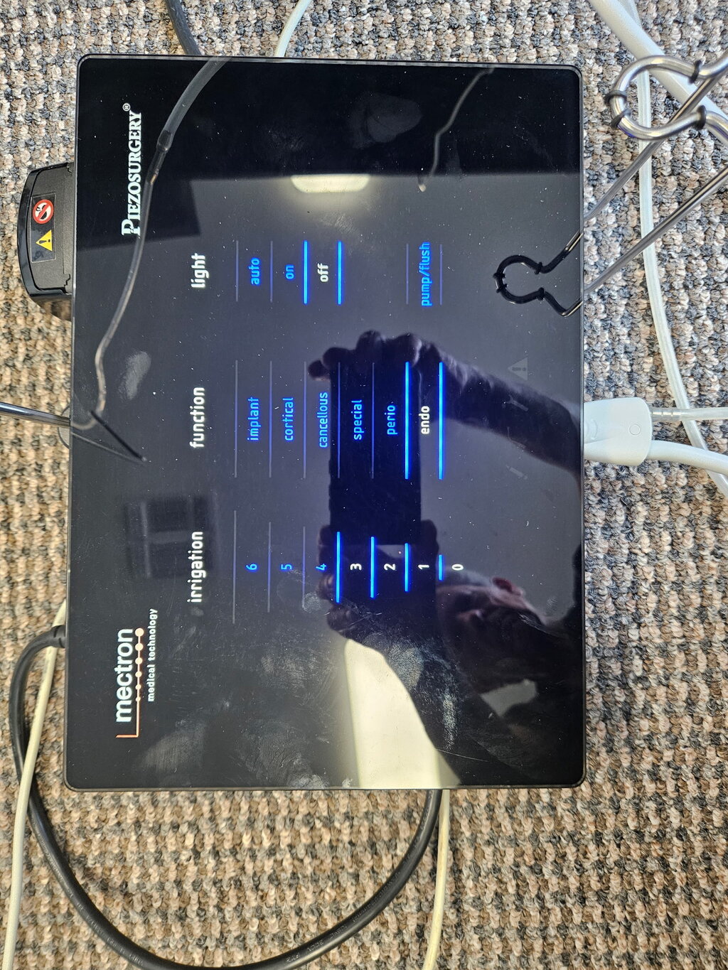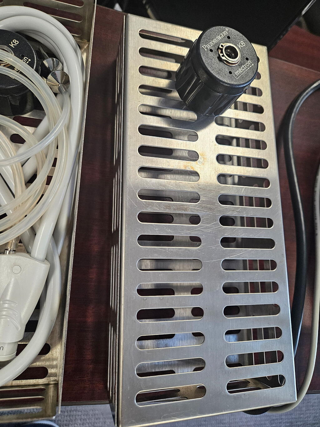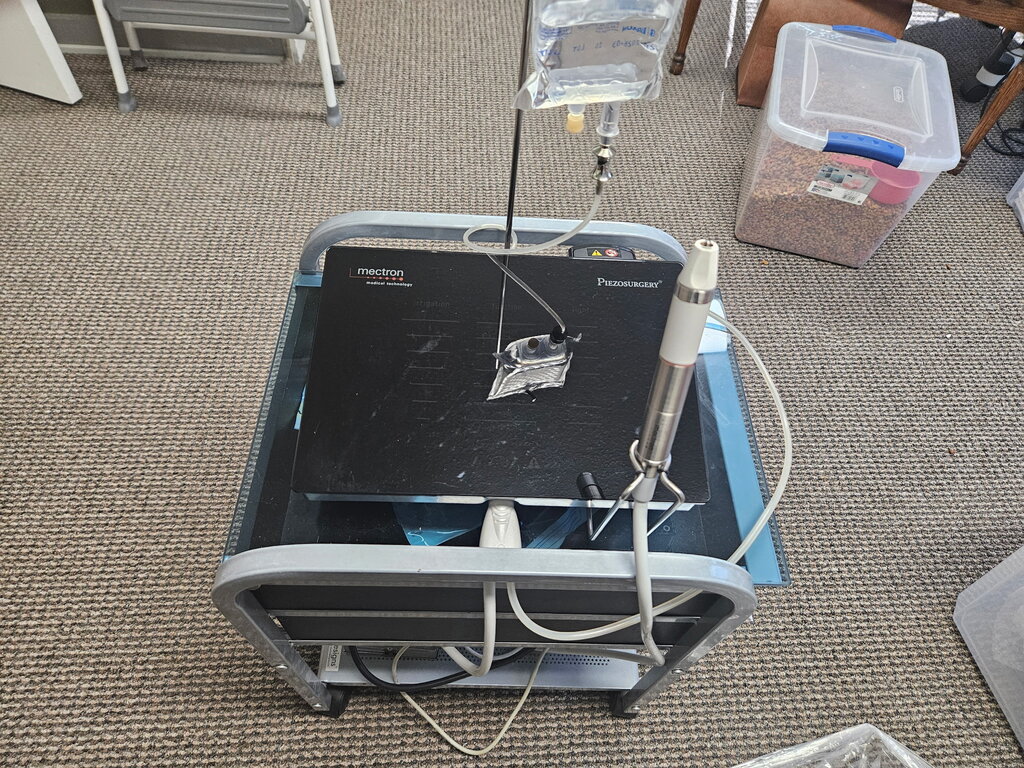 Mectron Piezosurgery  unit with two handpieces and assortment of new and used tips. Unit uses sterile water.  Good working condition . Only flaw the fiber optics on both handpieces  stop working, but otherwise work fine, I use loops with a light . So visibility was nom problem.