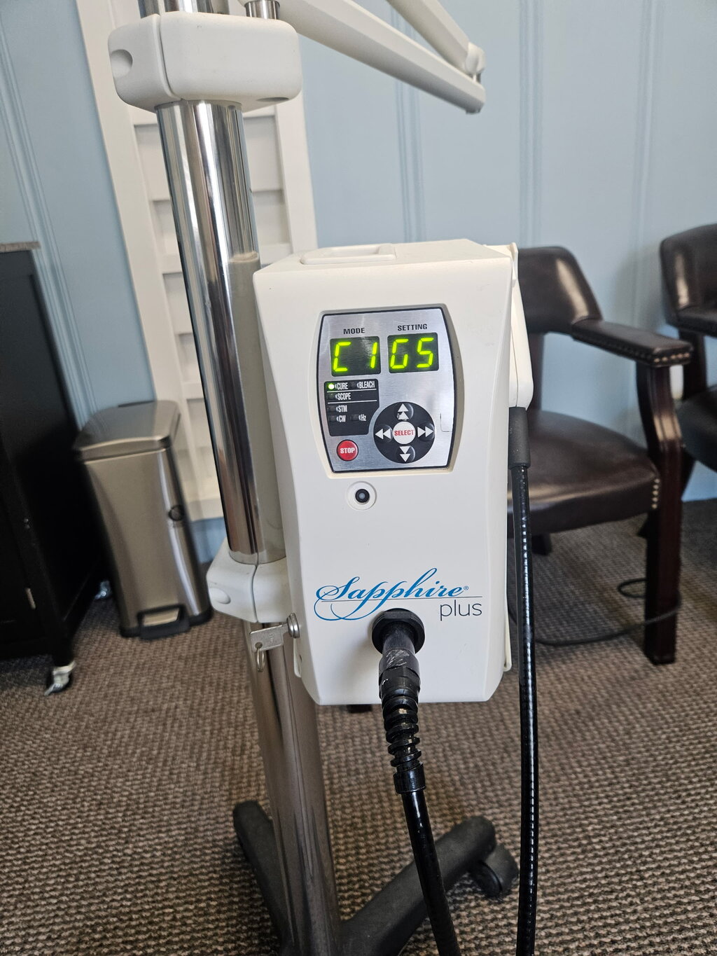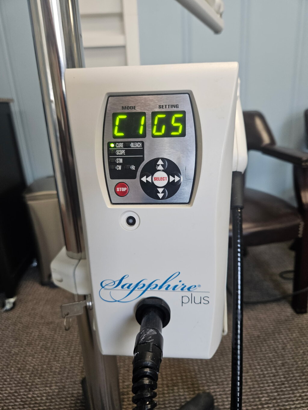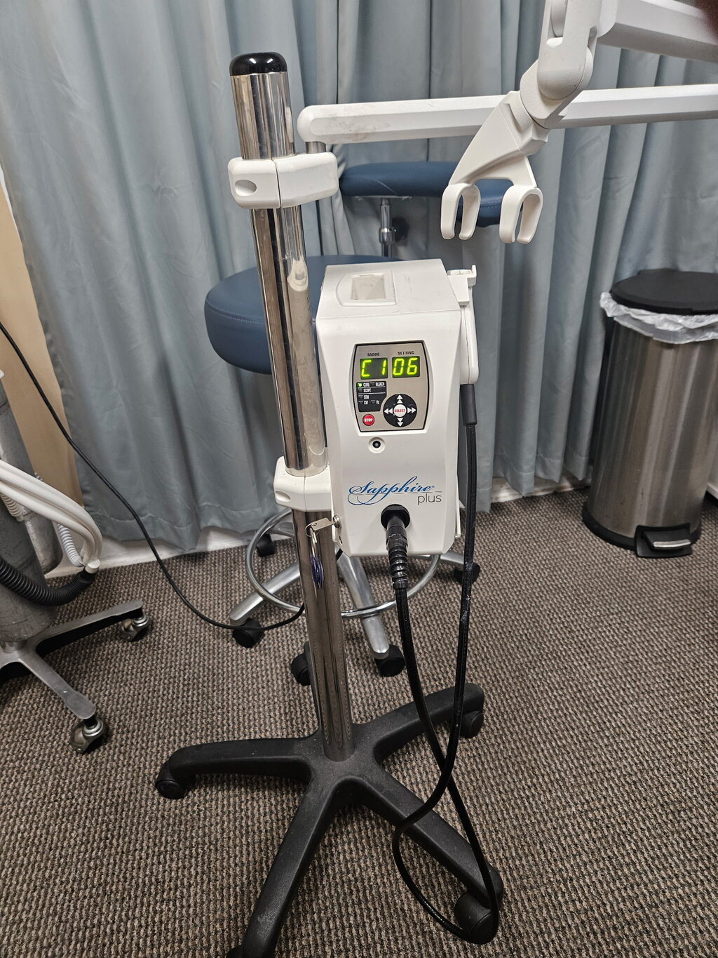 DENMAT SAPPHIRE PLUS CURING LIGHT, cures 5-6 mm in 5seconds, accepts Denmat laser if still  available, and can do in house bleaching with arm and bleaching tip