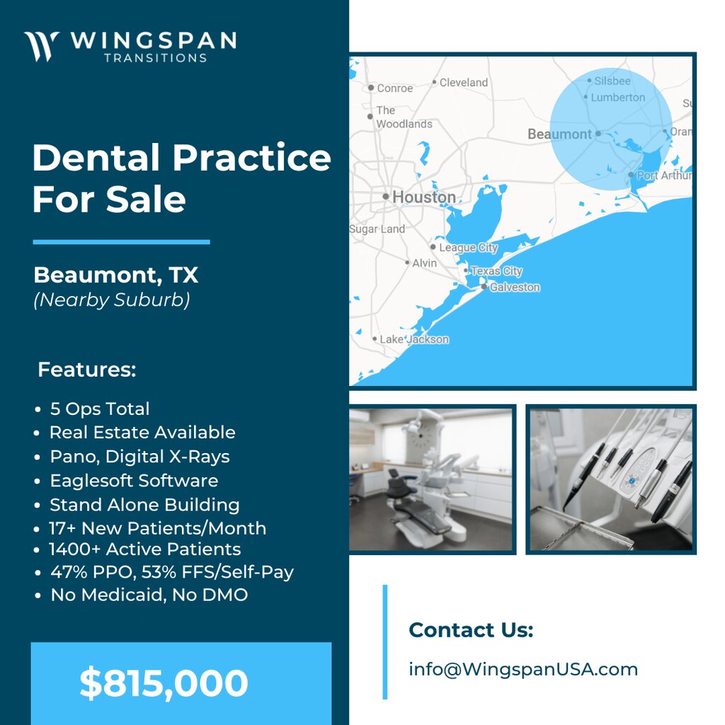 General Dental Practice – Beaumont, Texas (Nearby Suburb) – FOR SALE – $815,000 – Real Estate available in addition to the practice. Well-established legacy practice with deep community roots, originally founded in the late 1950s and later transitioned within the same family before moving to its current stand-alone facility over 25 years ago. For nearly three decades, the practice has built a strong, multi-generational patient base—now serving third- and fourth-generation families in a thriving Houston suburb. Equipped with 5 Ops, Pano, Digital X-ray, Intraoral Camera, and Eaglesoft Practice Management Software.The patient base is 53% FFS/Self Pay with 47% PPO Out of Network, no DMO, no Medicaid; The practice is out of network with all insurances. Practice is serving 17+ New Patients a Month on Average with 1,400+ active patients in the past 24 months. This practice focuses on bread-and-butter dentistry and presents clear expansion opportunities in higher-value procedures including endodontics, orthodontics, oral surgery, and implants. Currently operating just 3.5 days per week, a new owner can unlock immediate revenue growth by expanding clinical hours.. Our sellers require a signed NDA before we can share practice details. To get started, simply complete a Buyer Form and NDA at wingspantransitions.com/buyer-form. This only needs to be done once every six months. If you’ve already completed this within that timeframe, just email info@WingspanUSA.com or text us with your name and the listing you're interested in — we’ll verify your profile and NDA are active and send the details your way. Our goal is to respond within one business day.