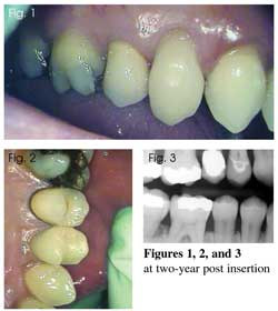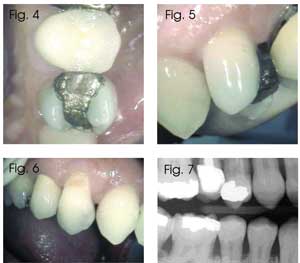 Strength of these restorations has not been an issue. In the past 2.5 years of my Cerec experience, I have had only four crowns fracture. One was due to inadequate reduction; the other was due to a defective block and the rest a result of inadequate occlusal adjustment. These failures occurred within the first 6 months of service. Restorations on recare visits look as good as the insertion date. (See Fig 1, 2, and 3)