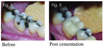 Patient acceptance has been excellent since many of the objections people have to crowns has been eliminated. Mention crowns to patients and they begin to think multiple appointments, shots, impressions with goop and artificial looking teeth with that gray line at the ginigva in the cases of the porcelain-to-metal crown. The ability to do onlays and preserve tooth structure is very appealing to patients (Figs. 8 and 9).