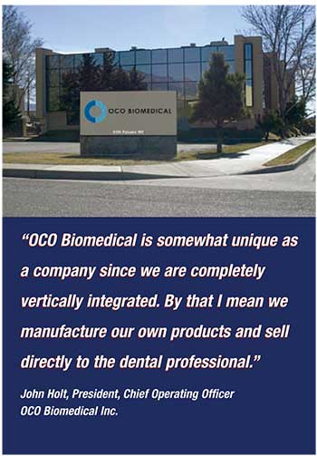 OCO Biomedical is somewhat unique as a company, since we are completely vertically integrated. By that I mean we manufacture our own products and sell directly to the dental professional. Our sales and customer service departments have developed close relationships with our customers and are available to talk with a doctor one-on-one. This provides a doctor with a superior level of support s/he has come to appreciate, especially when s/he is faced with a special case that requires a consultation. Our new Web site allows a doctor to view our complete product line and place an order 24 hours a day, seven days a week. We implemented this availability at the request of our dentists, since they are busy with patients most of the day and don’t have time to review their product needs and place an order until after hours.