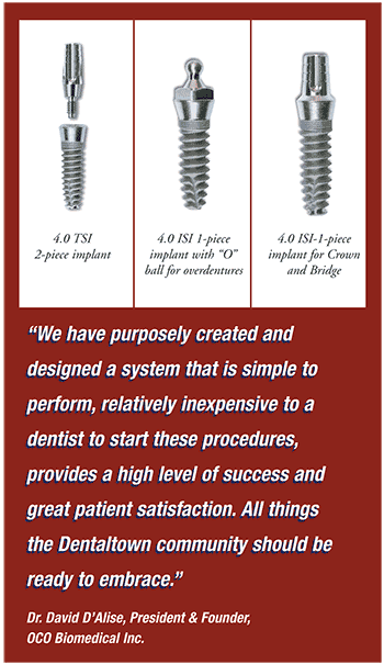 Many times since the birth of Dentistry, great innovations have been created by practicing dentists. Dr. David D’Alise is one of those dentists. In 1973, he identified a void of choices for an implant supported overdenture and he invented a solution. The O Company was born and continues to develop with an ever expanding line of products. The newest line is an implant designed for immediate loading. Recently, I had the opportunity to interview the key executives of OCO Biomedical.