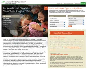 In 2009, the ADA Division of Global Affairs launched the International Volunteer Web page, a comprehensive, user-friendly resource for interested oral health professionals to learn about volunteerism and to easily identify a suitable volunteer opportunity with a database of more than 100 volunteer organizations. The quality of the site was recognized with an Association Media & Publishing Silver Excel award.