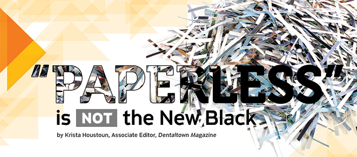 Patterson Dental: There are certainly chartless offices that only have digital charts. But most offices still get mail every day, and still have to print and mail materials to vendors or patients that haven't gone digital. So there are still times where offices have to work with paper. I think it's going to be pretty difficult to ever be completely paperless, but being chartless is definitely possible. However, I don't think there's any form of paper in an office right now that can't be a digital record, and I've trained more than 500 offices so I've seen a lot of documents.