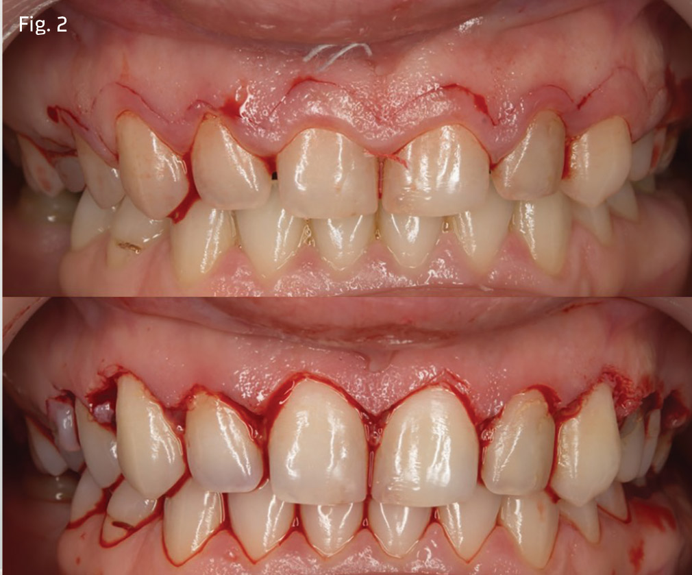 A gingivectomy was performed with a 15c blade. The blade followed the outlines which were transferred via a surgical stent. After the plain removal of gingival tissues a new tooth morphology could be visualized (Figs. 2 & 3).