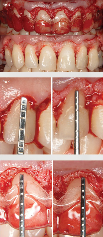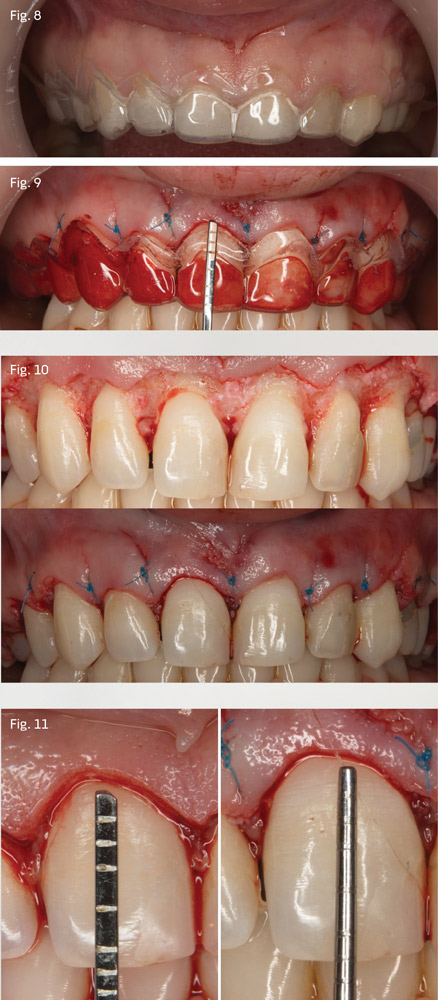 Following flap reflection, an osteotomy was performed in order to gain new bone morphology and compensate further gingival margin rebound. Considering this stage as an irreversible one, it is important to proceed meticulously. Again, a surgical stent is a powerful tool to gain a certainty in bone reduction (Figs. 5 -11).