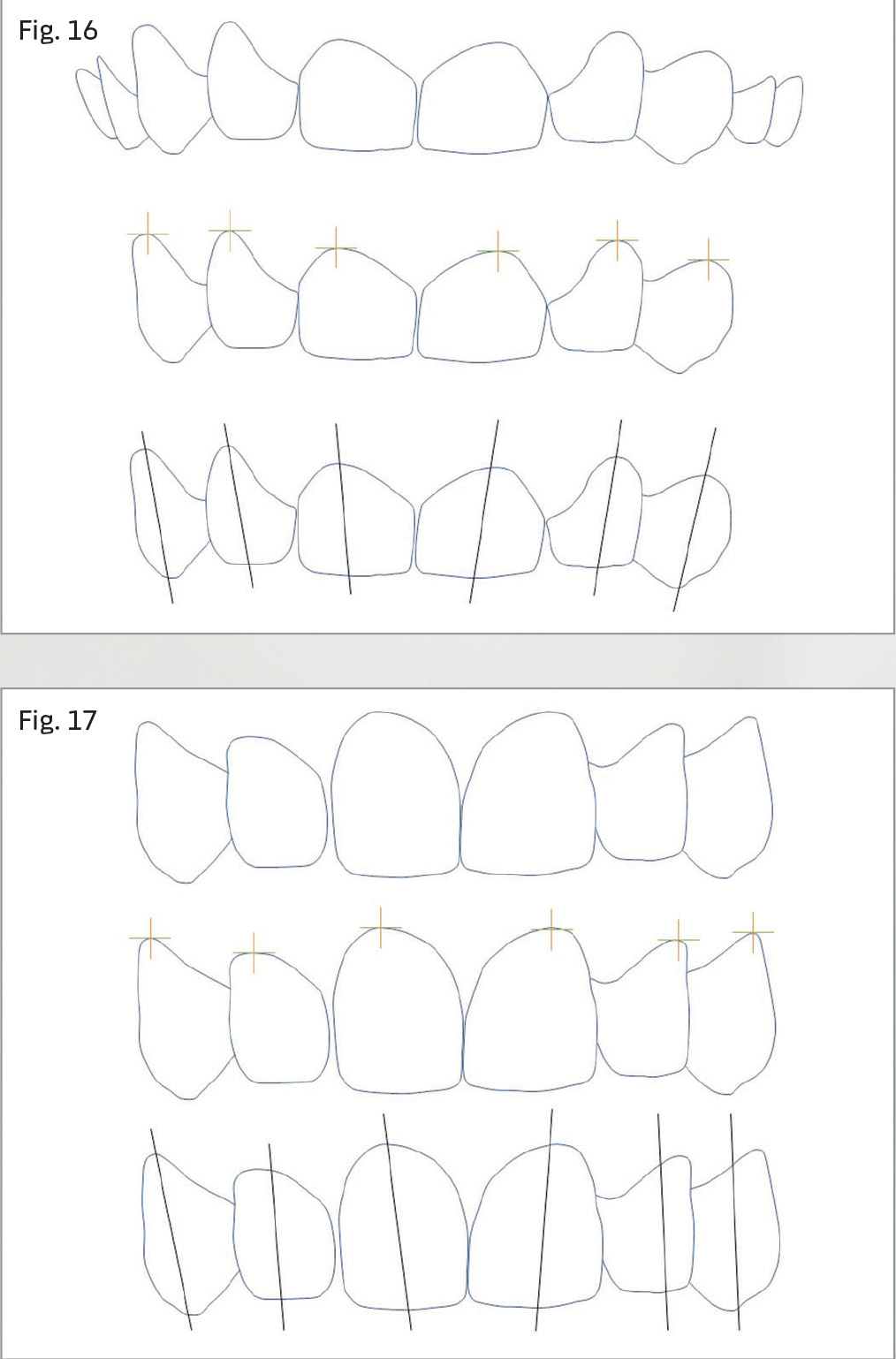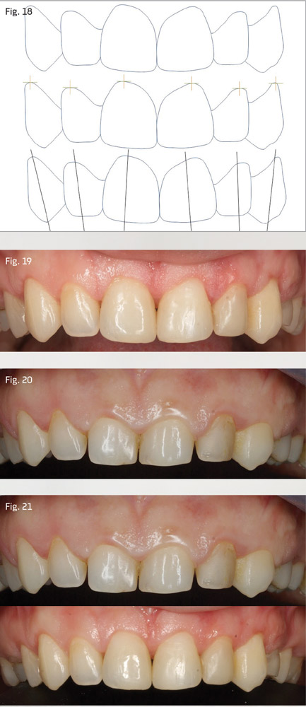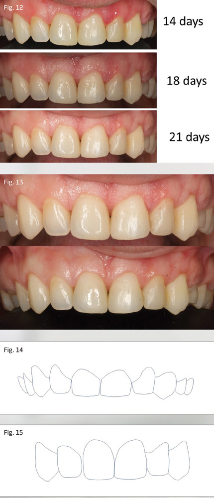 In this case, at 12 days, teeth where restored in a mock-up manner via injection molding. Going forward my plan is to deliver Emax veneers on the central incisor and upper right canine, and also a full coverage Emax crown on upper left second incisor. Mockups allow a great visual as to what further definite restoration results will look like. Additional images are included for better visualization (Figs. 12-22—see pp. 104 & 105).
