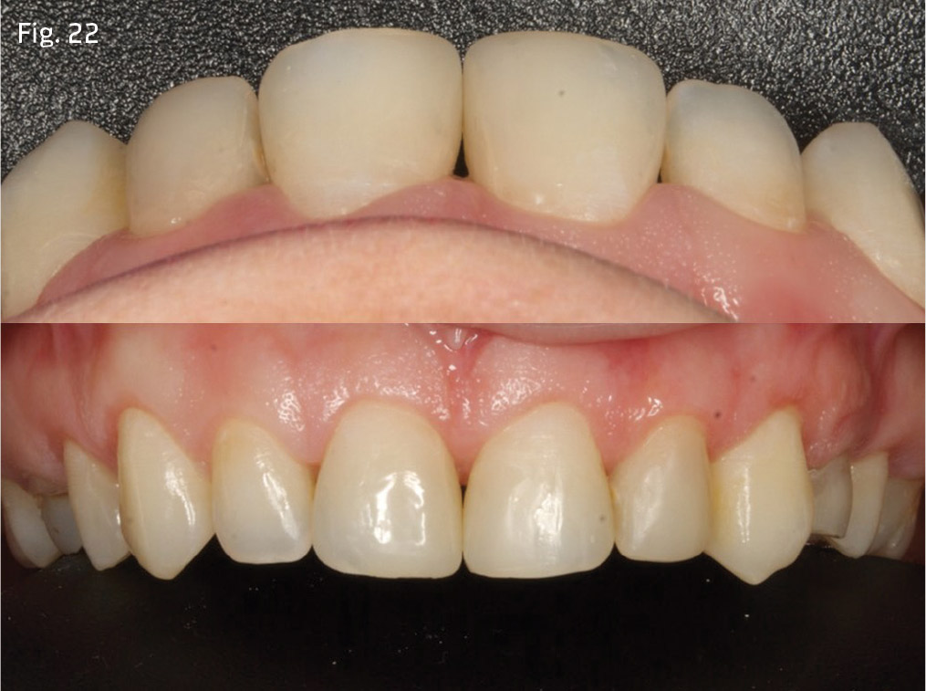 Flap approximation via suturing was identical to the position desired and transferred on the surgical stent Soft tissue maturation after surgical crown lengthening does require time, in some cases even as long as 12 months. Clinically, this parameter typically does not take that long. One month post-op soft tissue was present (Figs. 23 & 24).