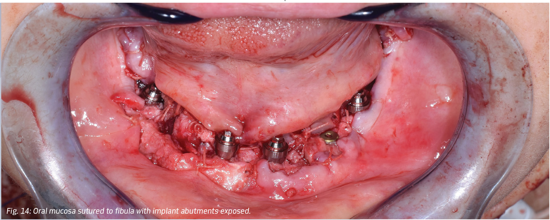 Fig. 14: Oral mucosa sutured to fibula with implant abutments exposed.