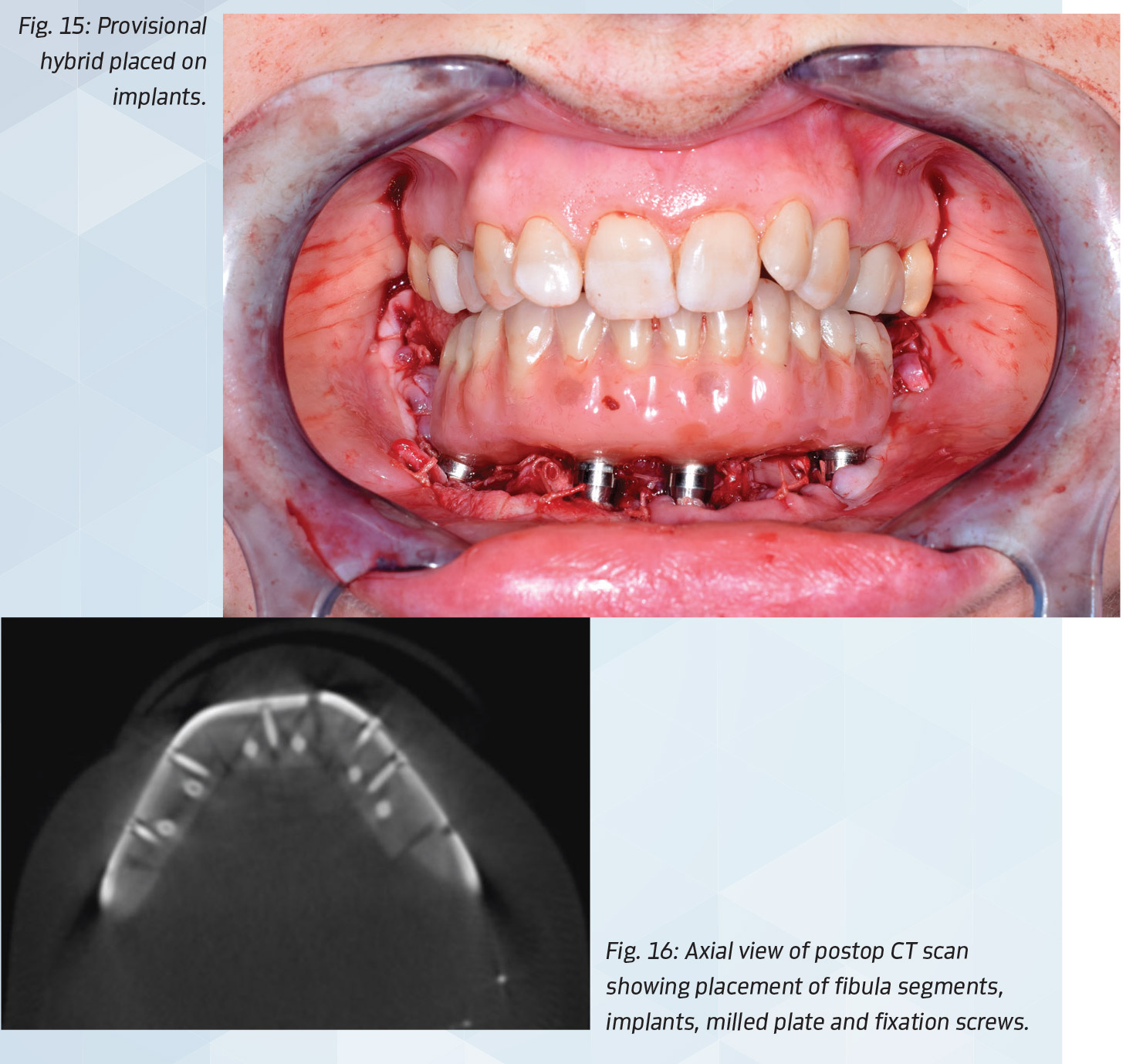 The neck was closed with 3-0 vicryl at the level of the platysma muscle, and 4-0 Prolene for skin. The oral mucosa was sutured to the fibula, with care to maintain exposure of the abutments (Fig. 14). The final hybrid prosthesis was placed and occlusion verified (Fig. 15). A postoperative CBCT scan showed the accuracy of implant placement, fixation screw placement and bone positioning possible with virtual 3-D planning (Figs. 16 and 17).