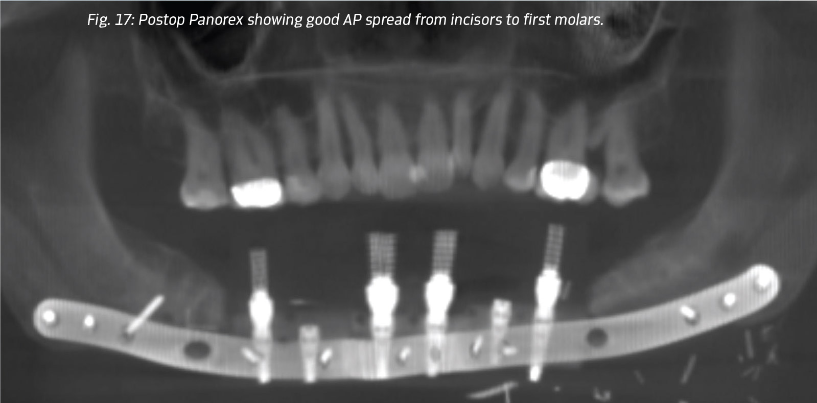 Fig. 17: Postop Panorex showing good AP spread from incisors to first molars.