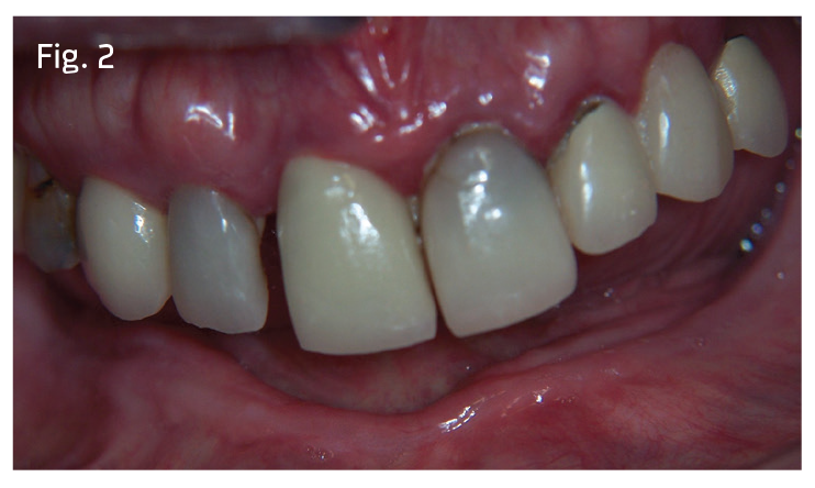 Her husband also had trouble eating for years before undergoing full-mouth mini-dental implant treatment, and he suggested that his wife could receive the same style of implant treatment. Such treatment had been discussed for a year, but a "cosmetic emergency" occurred when the patient broke a front tooth.