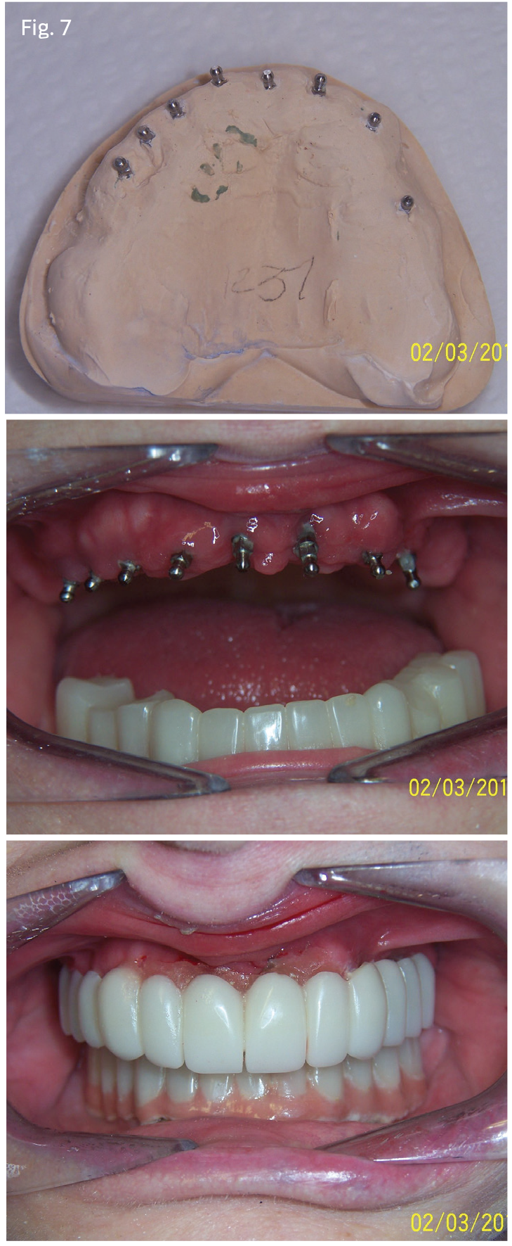 After removing the remaining maxillary teeth, six additional 2.5-by-13mm implants were placed to support the full arch restoration (Figs. 6 and 7). Two implants had been placed previously when the patient fractured teeth #7 and 9. The resin appliance was retrofitted and relined with a hard reline denture base. The restoration was cement with a resin cement. The occlusion was checked and adjusted. I dispensed a Water-Pik and an implant tooth brush with circular bristles to facilitate cleaning of the appliance.