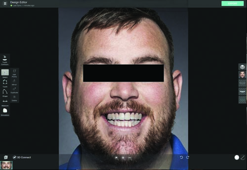 Fig. 12: It was very important to illustrate for the patient what the anticipated aesthetic and functional outcomes would look like, even before any procedures, to build his trust and confidence in the restorative process. Therefore, Smile Designer Pro was used to create a digital mock-up of the patient’s smile. This enabled the patient to visualize how his smile would be restored through a combination of root canal therapy, posts/cores and lithium disilicate crowns (e.g., IPS E.max) on teeth #6, #7, #8, #22 and #28; endosteal implants, custom abutments and IPS E.max crowns on teeth #3, #12 and #15; IPS E.max crowns on teeth #2, #4, #5, #10 (with post/core), #13 and #14; lithium disilicate (IPS E.max) veneers for teeth #9, #11 and #23 through #27; and conservative IPS E.max onlays for teeth #18 through #21 and #29 through #31.
