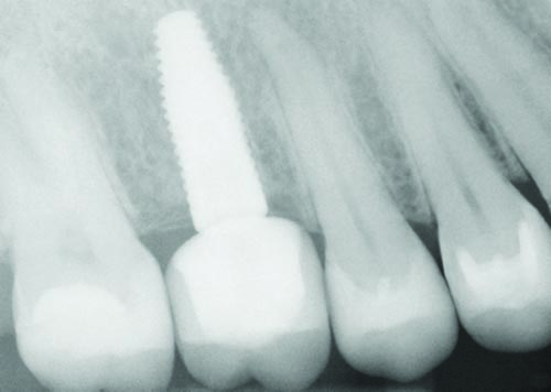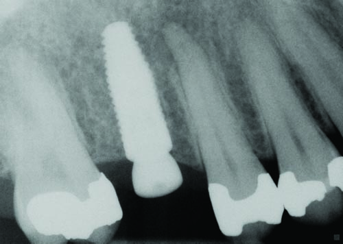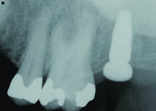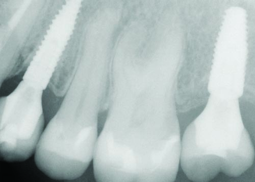 During the first appointment, oral prophylaxis and debridement were performed, and root canal therapy was undertaken for teeth 6–8, 22 and 28. In the afternoon, implants were placed at the sites of 3, 12 and 15 (Figs. 13–15, p. 36).