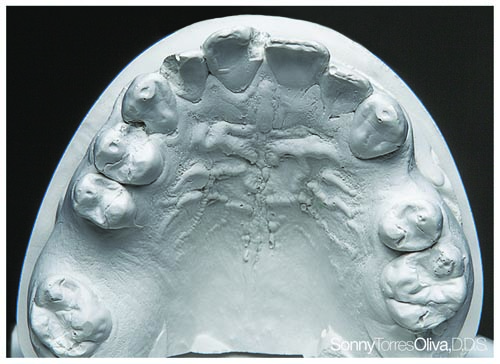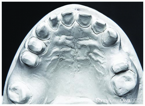 Fig. 7: Palatal view of the maxillary arch revealing the distal/lingual (DL) composite restorations on teeth #9 and #11.