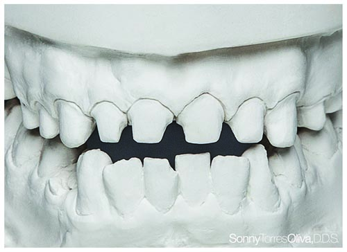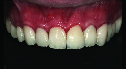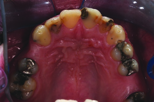 Fig. 5: Close-up retracted view of the maxillary central and lateral incisors. Examination revealed that teeth #7 and #8 presented carious lesions and periapical periodontitis (PAP) that would require root canal therapy. Tooth #10 had previously undergone root canal therapy, but no post or core had been placed.