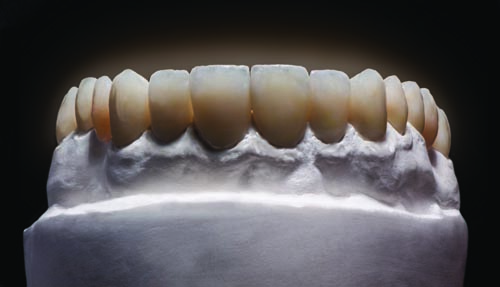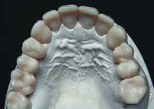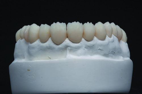 Fig. 28: The completed Telio CAD provisional restorations were tried back onto the model to verify fit and aesthetic qualities.