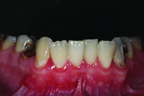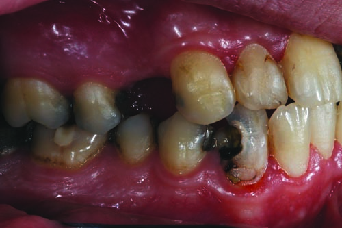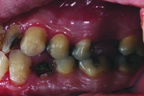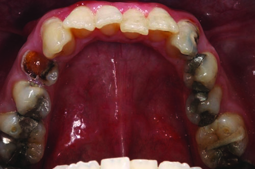 Fig. 2: Close-up retracted facial view of the patient’s upper and lower arches reveals extensive decay, missing teeth and obvious gingival inflammation.